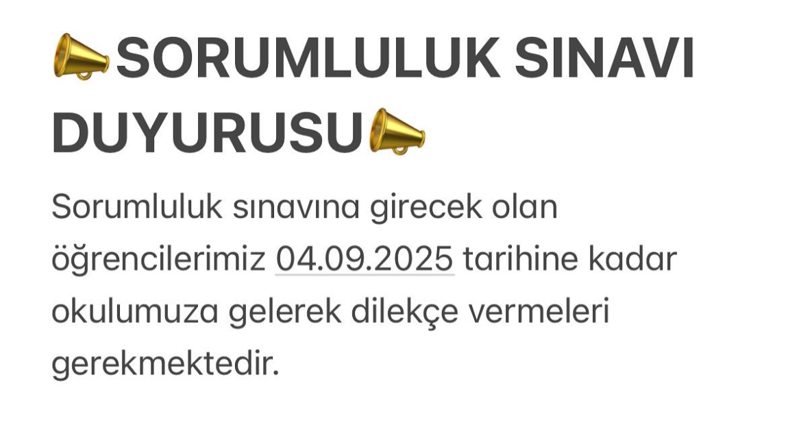 2025 Eylül dönemi sorumluluk sınavlarına girmek isteyen öğrencilerimizin 04.09.2025 Perşembe gününe kadar okulumuza gelerek sınavına girmek istedikleri derslerle ilgili dilekçe vermeleri gerekmektedir